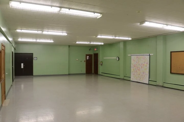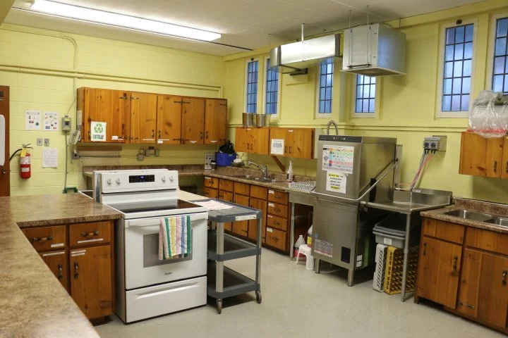 Soper Hall looking at entrance door. Commeral kitchener beind serving windows on right.